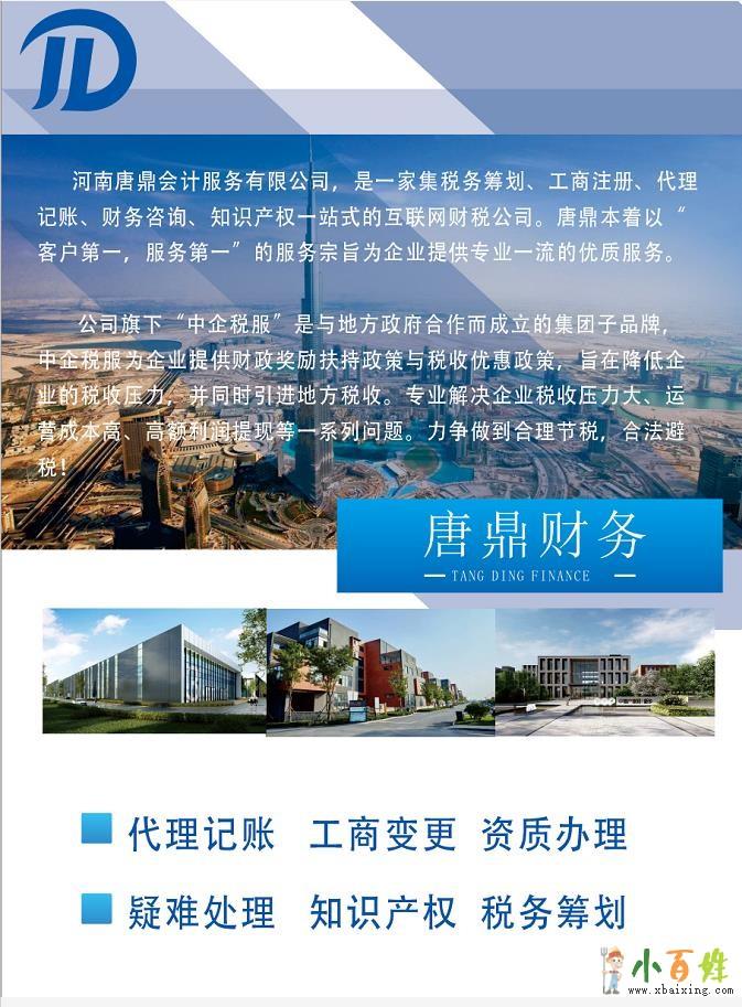 河南唐鼎财税有限公司新乡分公司是一个集工商注册、税务代理、企业咨询为一体的专业代理公司,是您企事业单位的贴身财税专家。涉及行业:商业、工业、服务业、餐饮业、旅店业、高新技术企业、进出口企业等。1、工商...